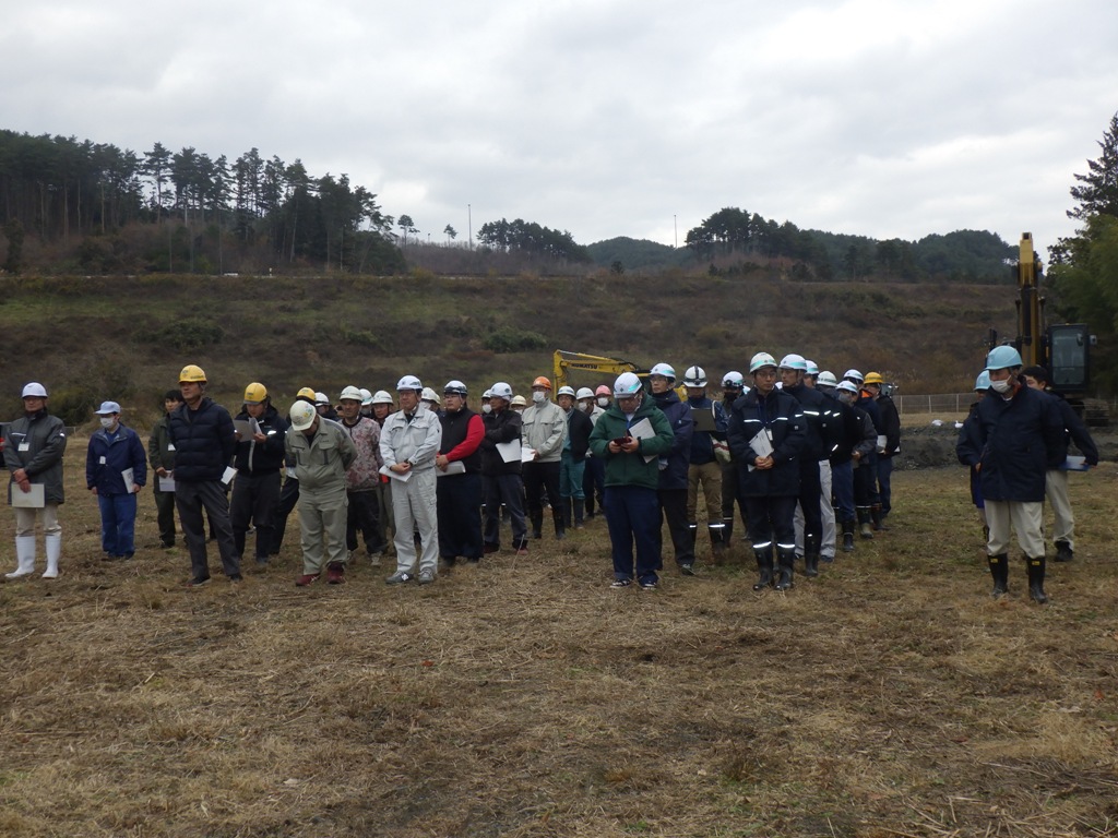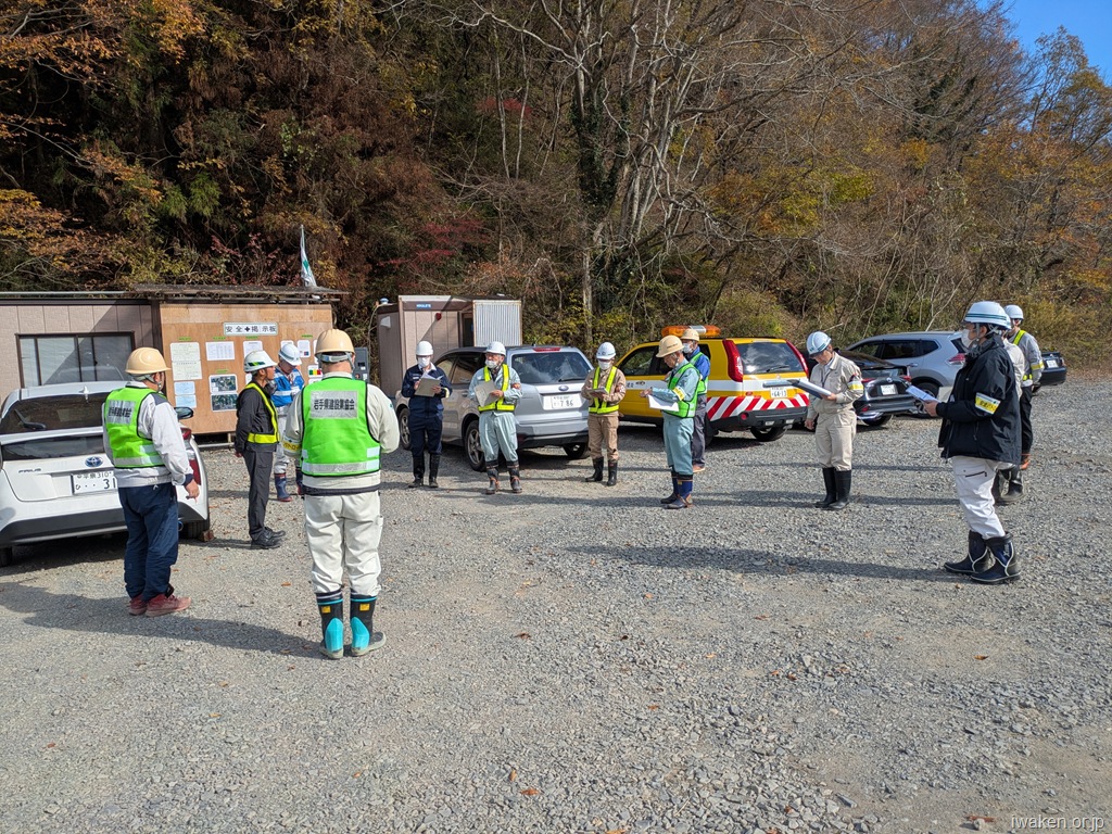 当日は、一関労働基準監督署、県南広域振興局一関土木センター、一関農村整備センター、一関市建設部、平泉町建設水道課、そして当支部の役員・安全指導者あわせて17名が参加しました。支部管内で進められている県・市発注の2つの工事現場を対象に点検を行い、各現場の担当者から工事概要や進捗状況、当日の作業内容、人員体制などについて説明を受けました。