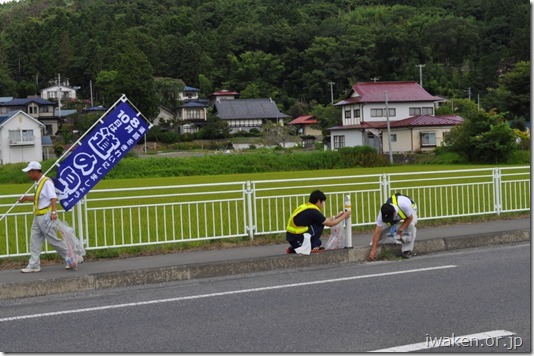 一関市川崎町「道の駅かわさき」、室根町「旬菜館」、東山町「ひがしやま季節館」の3会場に別れ、沿道のゴミ拾い、記念品(道路ふれあい月間のPR広告を印刷したウェットティッシュ)や希望郷いわて国体のPR用うちわや缶バッジの配布を行いました。