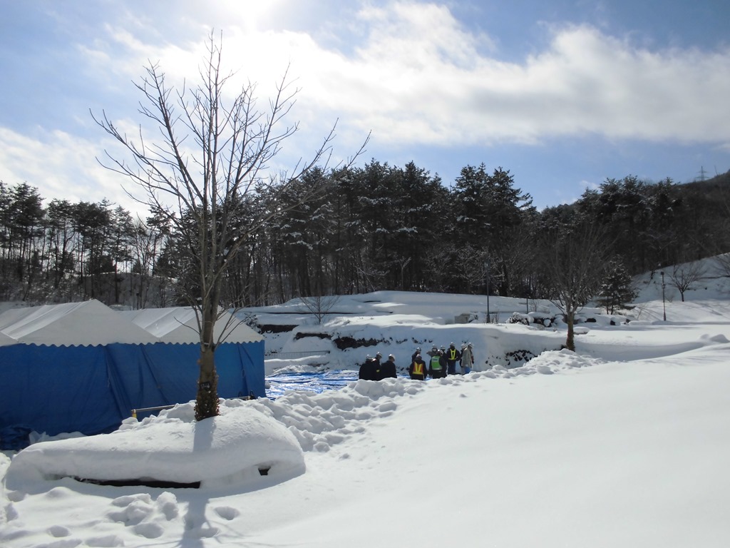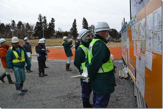 一関労働基準監督署、千厩土木センター、一関農村整備センター、一関市の方々にご同行いただきました。厳寒期に入って現場環境が悪化する時期であり、作業員の転倒や転落などに注意を払うよう促しました。