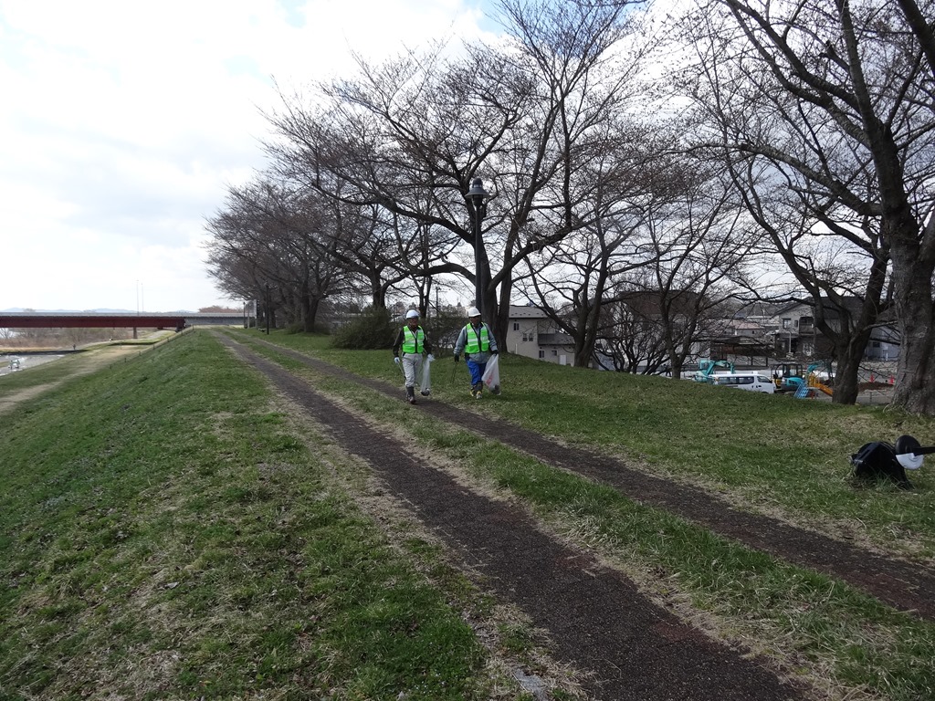 全体で開始式を行い、朝日橋下流から豊沢川合流点までと、豊沢橋左岸から北上川合流点までの往復約3キロにわたり、河川敷や堤防、遊歩道のごみ拾いをしました。