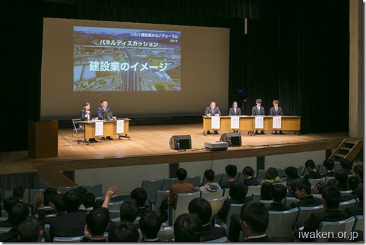 フォーラムでは、建設に係る取組発表では㈱テラから土木技術者、㈱高光建設から建築技術者、産業技術短期大学校からは建設業を目指す学生がそれぞれの取り組みを説明、パネルディスカッションでは岩手県建設業協会青年部連絡協議会青木会長をコーディネーター、取組発表の出演者をパネリストとして建設業のイメージ、現場の安全管理、資格取得についてなどのテーマで討論しました。
