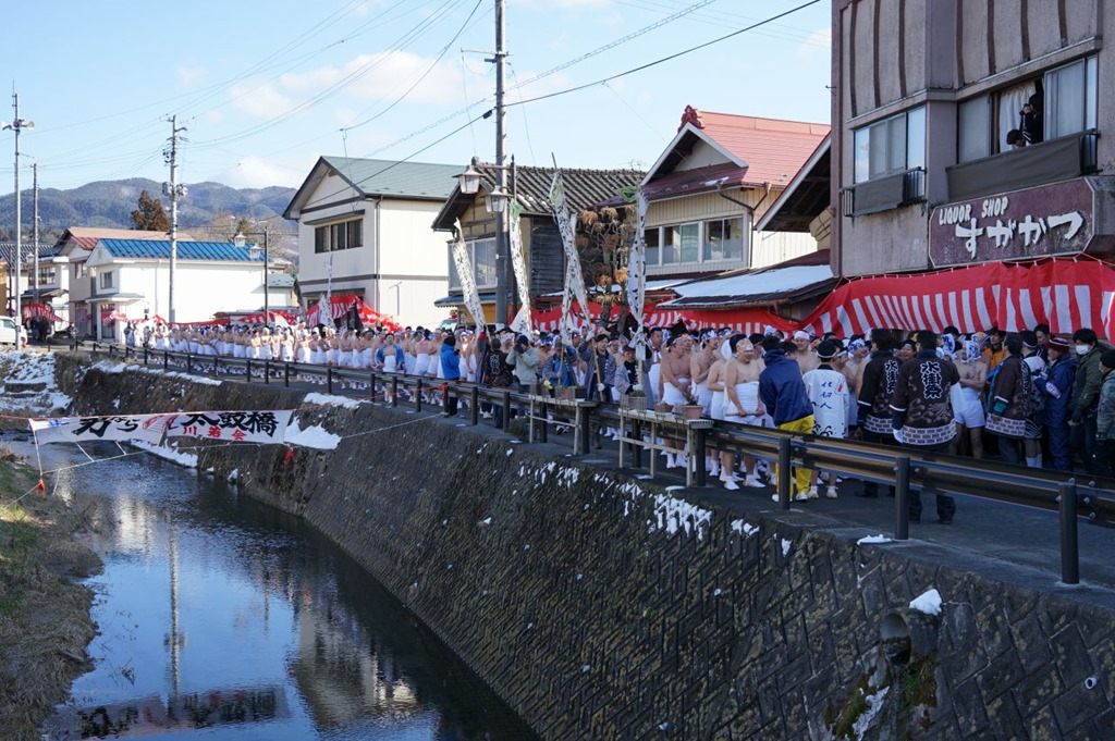 後年、厄年の人々の厄落しが併せて行われるようになり、今日では、厄落しと諸々の安全祈願が主流をなすようになっており、さらに近年は、1年間の無病息災と大願成就を祈願しての参加者も多くなっています。"(パンフレットより引用)八幡神社での祈祷を終えて、大原商店街に向かっては裸男衆が集まってきます。最後の"納め水"で、この川に入る地区もあります。