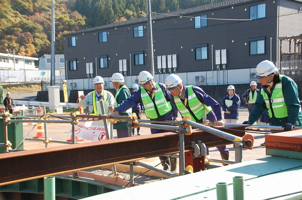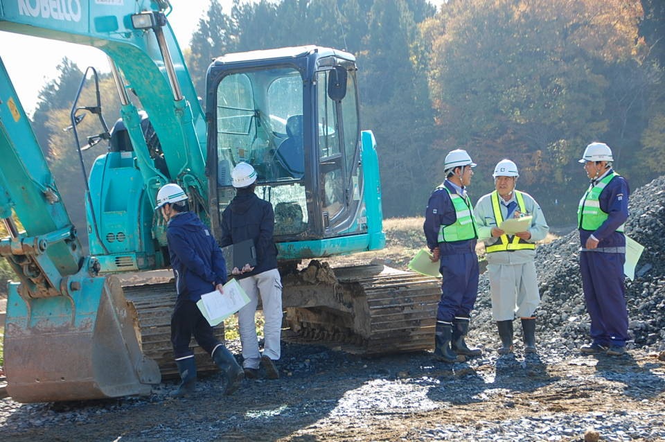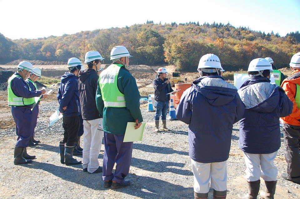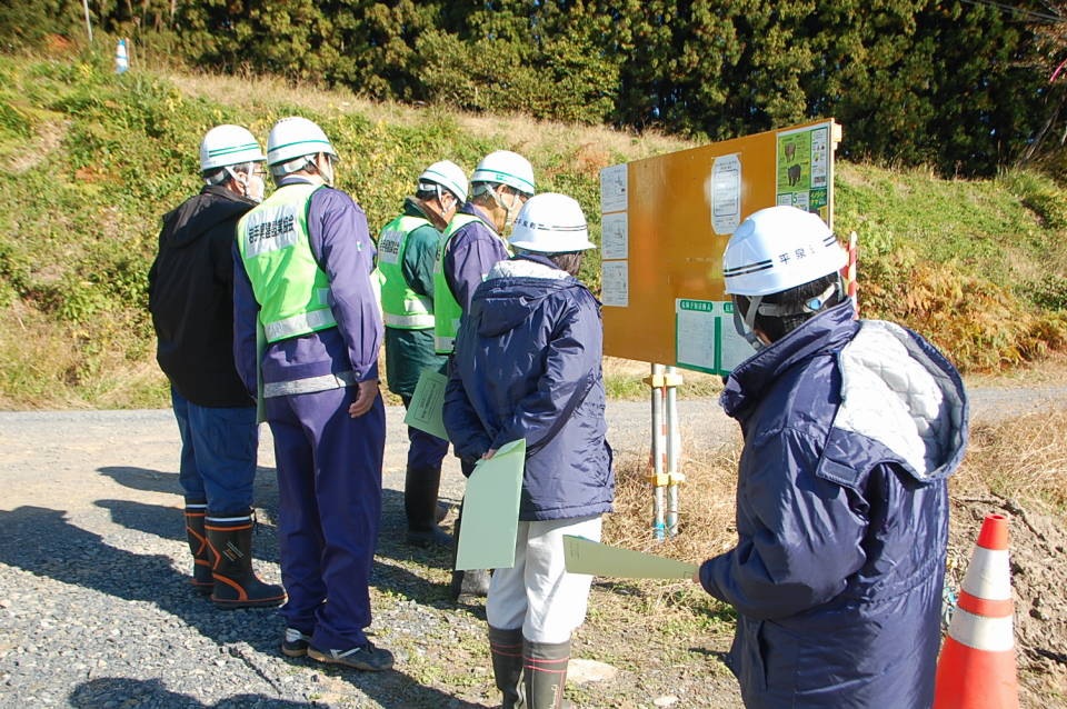 当日は、一関労働基準監督署、県南広域振興局一関土木センター、一関農村整備センター、一関市建設部、平泉町建設水道課、そして当支部の役員・安全指導者あわせて17名が参加しました。支部管内で進められている県・市発注の2つの工事現場を対象に点検を行い、各現場の担当者から工事概要や進捗状況、当日の作業内容、人員体制などについて説明を受けました。