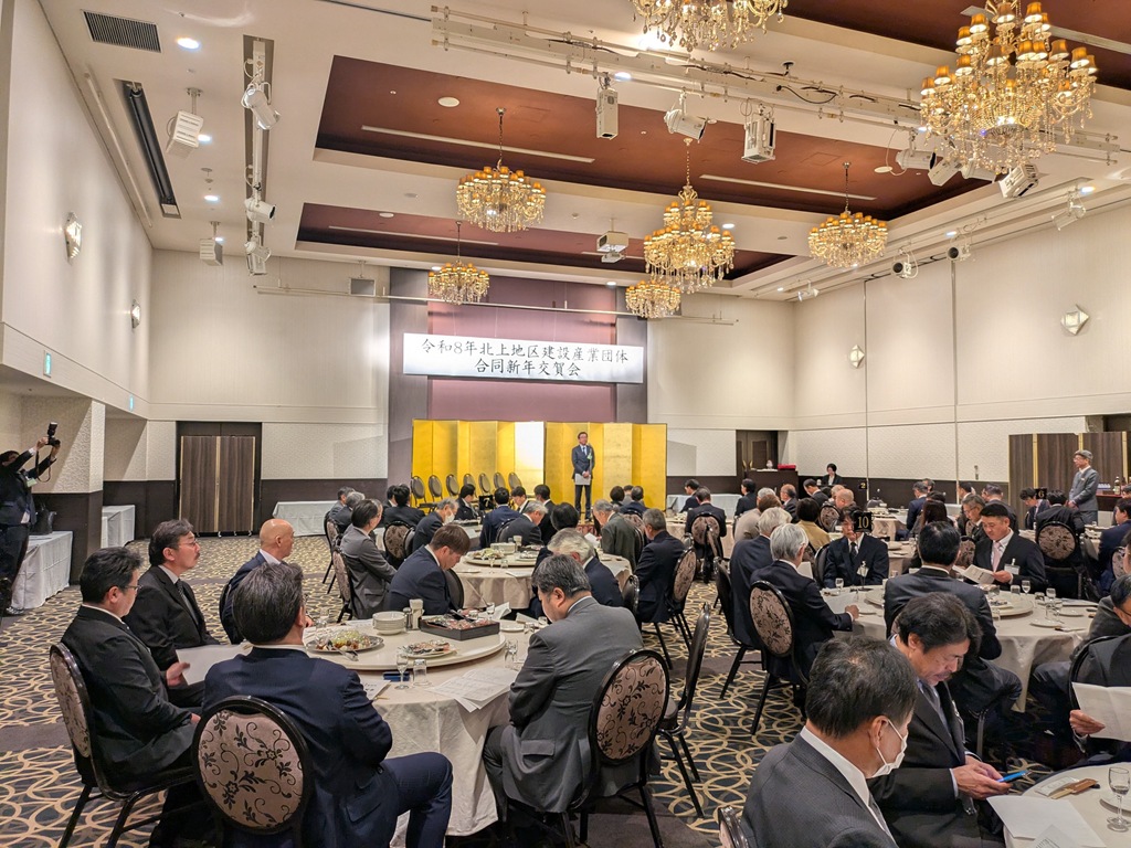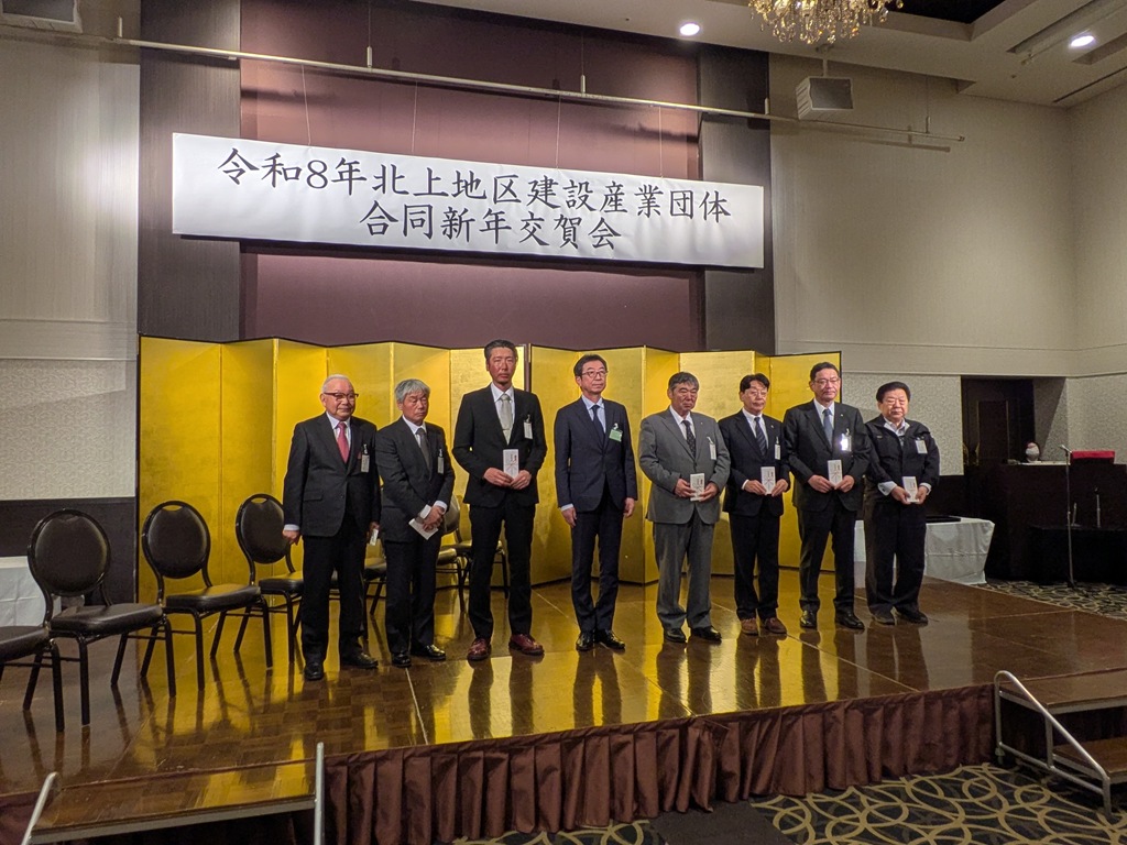 いわけんブログ ホームいわけんブログ令和8年 北上地区建設産業団体合同新年交賀会を開催 ≪ 前のエントリー 次のエントリー ≫ 令和8年 北上地区建設産業団体合同新年交賀会を開催 2026年1月23日北上支部 1月22日(木)ブランニュー北上において、岩手県建設業協会北上支部など関係12団体及び来賓等、総勢166人が出席し、北上地区建設産業団体合同新年交賀会が開催されました。【主催者を代表して八重樫博之 北上商工会議所建設産業部会長(岩手県建設業協会北上支部長)が挨拶】【交賀会の席上では、令和7年度優秀施工者国土交通大臣顕彰受賞者、岩手基礎工業(株) 小原 智氏、同知事表彰受賞者北海建設工業(株) 寺澤 信市氏 外6名の方々に記念品が贈呈されました。】【祝辞 八重樫浩文 北上市長】【祝辞 内記和彦 西和賀町長】 ブログ内検索 最近の記事 令和8年 一社)岩手県建設業協会奥州支部新年交賀会 令和8年 北上地区建設産業団体合同新年交賀会を開催 令和8年新年会を開催しました 第43回建設業経営者研修会・令和8年新年交賀会 令和8年新春講演会を開催しました 令和7年度 雇用改善推進表彰式 大船渡支部・分会 岩手県建設雇用改善推進表彰式 令和8年 会長年頭挨拶 優良県営建設工事表彰式・建設業新分野進出等表彰式 「建設キャリアアップシステム通信」第72号 カテゴリ 岩手県建設業協会 (816) 建設研修センター・建設会館 (59) 建設業労働災害防止協会 (99) 建退共岩手県支部 (90) 建設産業団体連合会 (36) 土木施工管理技士会 (31) 青年部連絡協議会 (23) 岩手県建設業女性協議会 (6) 盛岡支部 (199) 花巻支部 (202) 北上支部 (234) 奥州支部 (124) 一関支部 (269) 千厩支部 (392) 大船渡支部 (174) 遠野支部 (78) 釜石支部 (170) 宮古支部 (230) 岩泉支部 (121) 久慈支部 (158) 二戸支部 (117) 花林舎 (40) コンプライアンス (9) 東日本大震災 (81) 月別アーカイブ 2026年 1月 (8) 2025年 12月 (21) 11月 (15) 10月 (9) 9月 (8) 8月 (14) 7月 (12) 6月 (14) 5月 (6) 4月 (9) 3月 (10) 2月 (9) 1月 (9) 2024年 12月 (17) 11月 (22) 10月 (17) 9月 (11) 8月 (13) 7月 (8) 6月 (16) 5月 (12) 4月 (6) 3月 (4) 2月 (5) 1月 (11) 2023年 12月 (17) 11月 (16) 10月 (15) 9月 (10) 8月 (18) 7月 (11) 6月 (19) 5月 (11) 4月 (11) 3月 (4) 2月 (5) 1月 (4) 2022年 12月 (18) 11月 (17) 10月 (17) 9月 (13) 8月 (14) 7月 (9) 6月 (18) 5月 (9) 4月 (9) 3月 (5) 2月 (6) 1月 (6) 2021年 12月 (16) 11月 (20) 10月 (12) 9月 (3) 8月 (19) 7月 (13) 6月 (10) 5月 (3) 4月 (6) 3月 (5) 2月 (11) 1月 (5) 2020年 12月 (16) 11月 (21) 10月 (20) 9月 (18) 8月 (23) 7月 (17) 6月 (11) 5月 (6) 4月 (2) 3月 (9) 2月 (8) 1月 (11) 2019年 12月 (9) 11月 (24) 10月 (20) 9月 (10) 8月 (19) 7月 (18) 6月 (9) 5月 (16) 4月 (9) 3月 (9) 2月 (13) 1月 (16) 2018年 12月 (15) 11月 (26) 10月 (18) 9月 (7) 8月 (19) 7月 (25) 6月 (15) 5月 (11) 4月 (13) 3月 (10) 2月 (17) 1月 (10) 2017年 12月 (12) 11月 (17) 10月 (20) 9月 (8) 8月 (28) 7月 (20) 6月 (14) 5月 (14) 4月 (18) 3月 (20) 2月 (18) 1月 (16) 2016年 12月 (19) 11月 (22) 10月 (16) 9月 (33) 8月 (23) 7月 (23) 6月 (17) 5月 (20) 4月 (25) 3月 (20) 2月 (16) 1月 (13) 2015年 12月 (20) 11月 (21) 10月 (27) 9月 (10) 8月 (22) 7月 (20) 6月 (15) 5月 (17) 4月 (16) 3月 (17) 2月 (15) 1月 (14) 2014年 12月 (19) 11月 (27) 10月 (24) 9月 (18) 8月 (39) 7月 (21) 6月 (18) 5月 (16) 4月 (21) 3月 (22) 2月 (15) 1月 (20) 2013年 12月 (21) 11月 (23) 10月 (20) 9月 (12) 8月 (18) 7月 (33) 6月 (20) 5月 (30) 4月 (16) 3月 (10) 2月 (8) 1月 (13) 2012年 12月 (15) 11月 (16) 10月 (13) 9月 (12) 8月 (17) 7月 (11) 6月 (10) 5月 (12) 4月 (11) 3月 (6) 2月 (9) 1月 (12) 2011年 12月 (11) 11月 (15) 10月 (15) 9月 (10) 8月 (18) 7月 (22) 6月 (14) 5月 (14) 4月 (13) 3月 (20) 2月 (15) 1月 (14) 2010年 12月 (10) 11月 (9) 10月 (20) 9月 (18) 8月 (20) 7月 (12) 6月 (16) 5月 (15) 4月 (14) 3月 (8) 2月 (13) 1月 (21) 2009年 12月 (16) 11月 (23) 10月 (38) 9月 (33) 8月 (26) 7月 (27) 6月 (24) 5月 (13) 4月 (17) 3月 (15) 2月 (23) 1月 (31) 2008年 12月 (37) 11月 (30) 10月 (55) 9月 (40) 8月 (49) 7月 (48) 6月 (35) 5月 (17) 4月 (10) 3月 (6) 2月 (9) 1月 (13) 2007年 12月 (12) 11月 (14) 10月 (20) 9月 (14) 8月 (20) 7月 (13) 6月 (15) 5月 (10) 4月 (6) 3月 (14) 2月 (16) 1月 (5) 2006年 12月 (13) にゃんぜん だいいちガンちゃん Follow @twitter