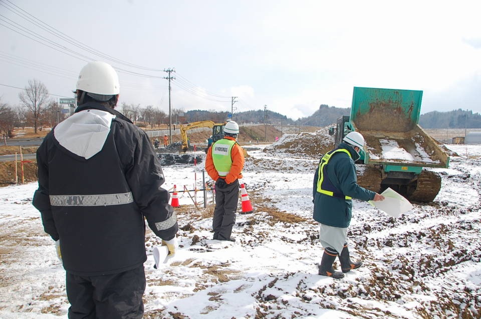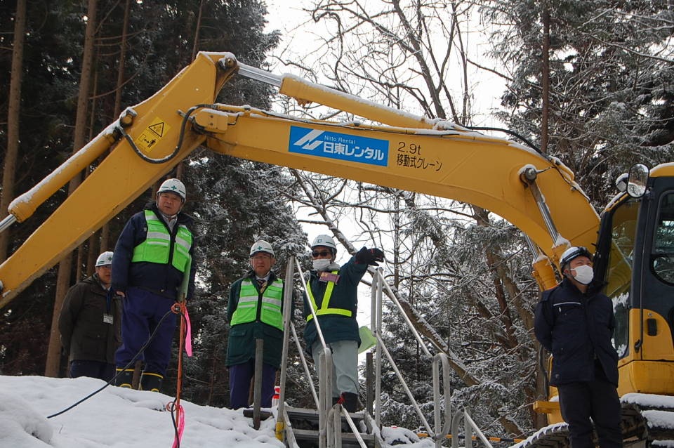 当日は、一関労働基準監督署、県南広域振興局一関土木センター、同農政部一関農林振興センター、同農政部一関農村整備センター、一関市建設部、平泉町建設水道課、当支部役員および安全指導者の計18名が参加しました。支部管内の県発注工事(平泉町内)および一関市発注工事の現場を点検し、安全対策の状況を確認しました。