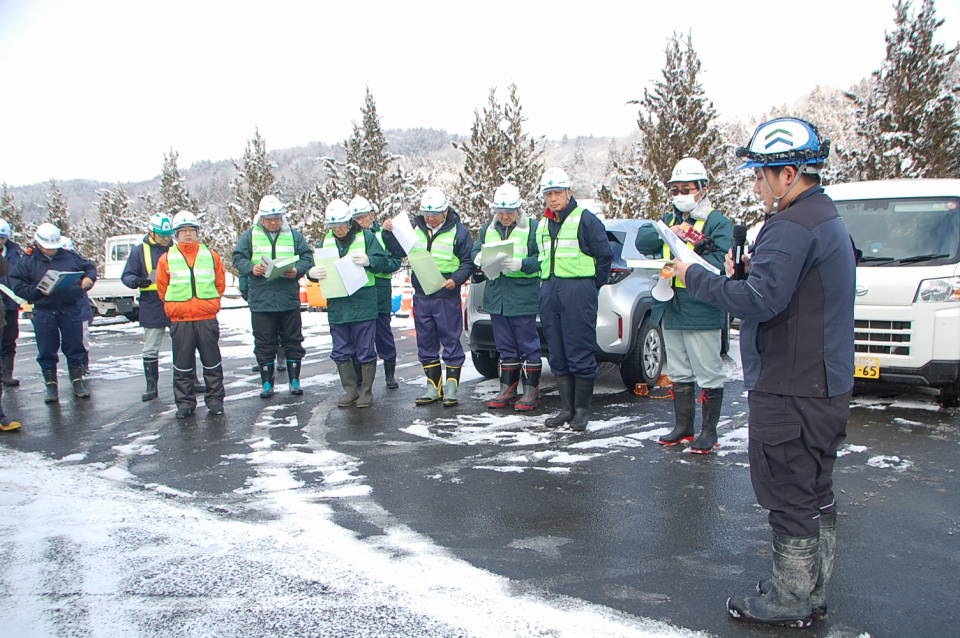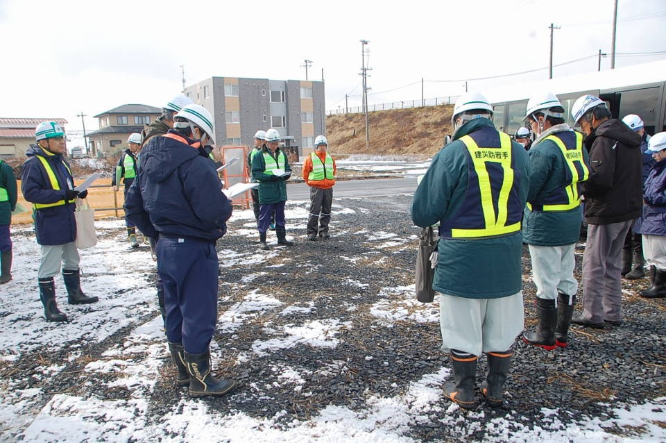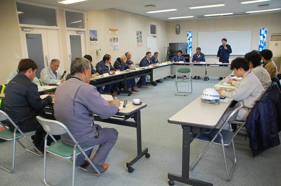パトロール終了後は支部に戻り、現場代理人出席のもと検討会を開催。両現場での好事例や、より工夫を要する点などについて意見交換を行いました。また、一関労働基準監督署の鈴木地方産業安全専門官からは、講評の中で冬季特有の災害への注意点についてご指摘いただき、市内で発生した他産業での死亡災害事例にも触れながら、災害防止に向けた注意喚起がありました。