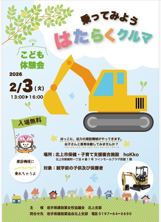 いわけんブログ ホームいわけんブログ建設業担い手育成イベント「乗ってみよう はたらくクルマ」を開催 ≪ 前のエントリー 建設業担い手育成イベント「乗ってみよう はたらくクルマ」を開催 2026年2月06日北上支部 岩手県建設業女性協議会北上支部では、2月3日(火)、北上市保健・子育て支援複合施設「hoKko」において、就学前の子供と保護者を対象に、建設業担い手育成イベント「乗ってみようはたらくクルマ!!」を開催しました。このイベントは、道路や橋を造っている本物の建設機械の乗車体験やおもちゃの建設機械での遊びを通じて、親子で楽しみながら建設業に対する理解を深めてもらおうと企画しました。【本物の建設機械の乗車体験】【おもちゃの建設機械での遊び】 ブログ内検索 最近の記事 建設業担い手育成イベント「乗ってみよう はたらくクルマ」を開催 「建設キャリアアップシステム通信」第7号 第2回現場合同安全パトロール実施 令和7年度盛岡支部安全衛生研修会を開催しました 『優良県営建設工事表彰受賞披露祝賀会』『令和8年新年を迎える会』を開催いたしました 令和8年 一社)岩手県建設業協会奥州支部新年交賀会 令和8年 北上地区建設産業団体合同新年交賀会を開催 令和8年新年会を開催しました 第43回建設業経営者研修会・令和8年新年交賀会 令和8年新春講演会を開催しました カテゴリ 岩手県建設業協会 (818) 建設研修センター・建設会館 (59) 建設業労働災害防止協会 (99) 建退共岩手県支部 (90) 建設産業団体連合会 (36) 土木施工管理技士会 (31) 青年部連絡協議会 (23) 岩手県建設業女性協議会 (6) 盛岡支部 (200) 花巻支部 (202) 北上支部 (235) 奥州支部 (124) 一関支部 (270) 千厩支部 (393) 大船渡支部 (174) 遠野支部 (78) 釜石支部 (170) 宮古支部 (230) 岩泉支部 (121) 久慈支部 (158) 二戸支部 (117) 花林舎 (40) コンプライアンス (9) 東日本大震災 (81) 月別アーカイブ 2026年 2月 (3) 1月 (10) 2025年 12月 (21) 11月 (15) 10月 (9) 9月 (8) 8月 (14) 7月 (12) 6月 (14) 5月 (6) 4月 (9) 3月 (10) 2月 (9) 1月 (9) 2024年 12月 (17) 11月 (22) 10月 (17) 9月 (11) 8月 (13) 7月 (8) 6月 (16) 5月 (12) 4月 (6) 3月 (4) 2月 (5) 1月 (11) 2023年 12月 (17) 11月 (16) 10月 (15) 9月 (10) 8月 (18) 7月 (11) 6月 (19) 5月 (11) 4月 (11) 3月 (4) 2月 (5) 1月 (4) 2022年 12月 (18) 11月 (17) 10月 (17) 9月 (13) 8月 (14) 7月 (9) 6月 (18) 5月 (9) 4月 (9) 3月 (5) 2月 (6) 1月 (6) 2021年 12月 (16) 11月 (20) 10月 (12) 9月 (3) 8月 (19) 7月 (13) 6月 (10) 5月 (3) 4月 (6) 3月 (5) 2月 (11) 1月 (5) 2020年 12月 (16) 11月 (21) 10月 (20) 9月 (18) 8月 (23) 7月 (17) 6月 (11) 5月 (6) 4月 (2) 3月 (9) 2月 (8) 1月 (11) 2019年 12月 (9) 11月 (24) 10月 (20) 9月 (10) 8月 (19) 7月 (18) 6月 (9) 5月 (16) 4月 (9) 3月 (9) 2月 (13) 1月 (16) 2018年 12月 (15) 11月 (26) 10月 (18) 9月 (7) 8月 (19) 7月 (25) 6月 (15) 5月 (11) 4月 (13) 3月 (10) 2月 (17) 1月 (10) 2017年 12月 (12) 11月 (17) 10月 (20) 9月 (8) 8月 (28) 7月 (20) 6月 (14) 5月 (14) 4月 (18) 3月 (20) 2月 (18) 1月 (16) 2016年 12月 (19) 11月 (22) 10月 (16) 9月 (33) 8月 (23) 7月 (23) 6月 (17) 5月 (20) 4月 (25) 3月 (20) 2月 (16) 1月 (13) 2015年 12月 (20) 11月 (21) 10月 (27) 9月 (10) 8月 (22) 7月 (20) 6月 (15) 5月 (17) 4月 (16) 3月 (17) 2月 (15) 1月 (14) 2014年 12月 (19) 11月 (27) 10月 (24) 9月 (18) 8月 (39) 7月 (21) 6月 (18) 5月 (16) 4月 (21) 3月 (22) 2月 (15) 1月 (20) 2013年 12月 (21) 11月 (23) 10月 (20) 9月 (12) 8月 (18) 7月 (33) 6月 (20) 5月 (30) 4月 (16) 3月 (10) 2月 (8) 1月 (13) 2012年 12月 (15) 11月 (16) 10月 (13) 9月 (12) 8月 (17) 7月 (11) 6月 (10) 5月 (12) 4月 (11) 3月 (6) 2月 (9) 1月 (12) 2011年 12月 (11) 11月 (15) 10月 (15) 9月 (10) 8月 (18) 7月 (22) 6月 (14) 5月 (14) 4月 (13) 3月 (20) 2月 (15) 1月 (14) 2010年 12月 (10) 11月 (9) 10月 (20) 9月 (18) 8月 (20) 7月 (12) 6月 (16) 5月 (15) 4月 (14) 3月 (8) 2月 (13) 1月 (21) 2009年 12月 (16) 11月 (23) 10月 (38) 9月 (33) 8月 (26) 7月 (27) 6月 (24) 5月 (13) 4月 (17) 3月 (15) 2月 (23) 1月 (31) 2008年 12月 (37) 11月 (30) 10月 (55) 9月 (40) 8月 (49) 7月 (48) 6月 (35) 5月 (17) 4月 (10) 3月 (6) 2月 (9) 1月 (13) 2007年 12月 (12) 11月 (14) 10月 (20) 9月 (14) 8月 (20) 7月 (13) 6月 (15) 5月 (10) 4月 (6) 3月 (14) 2月 (16) 1月 (5) 2006年 12月 (13) にゃんぜん だいいちガンちゃん Follow @twitter